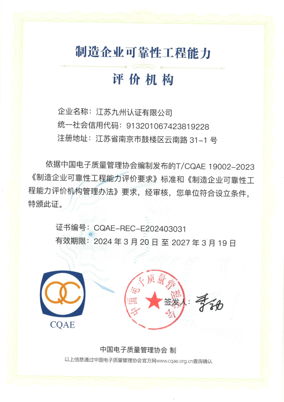 制造企業(yè)可靠性工程能力評價機構證書
